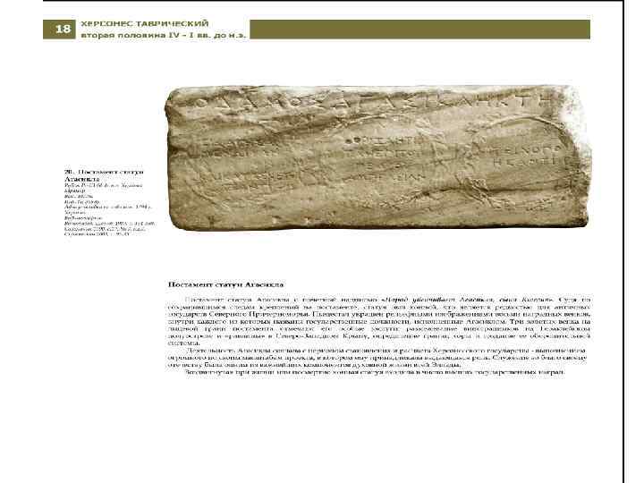 Текст надписи: "(Памятник) Аристона, сына Аттины, друга отечества. Бывшего послом (для ходатайства) о свободе к богу Августу шесть лет и утомившегося. Исполнявшего должность продика. Исполнявшего должность номофилака. Исполнявшего должность дамиурга прекрасно. Бывшего послом к царю Ремиталку о союзе и успевшего. Исполнявшего прекрасно должность жреца (народ наградил венком) и медным изображением. Управлявшего (государственной) казной и выяснившего денежные средства городу. Мраморный постамент от статуи. Найден в 1881 г. в районе главной улицы города. Датируется временем около середины II в. н. э. (131 - 154 гг. ). Бывшего послом к царю Ремиталку вторично и успевшего. Исполнявшего должность дамиурга прекрасно (народ наградил венком) и целой статуей. Бывшего прекрасным гражданином. - Исполнил Кефисодот» .