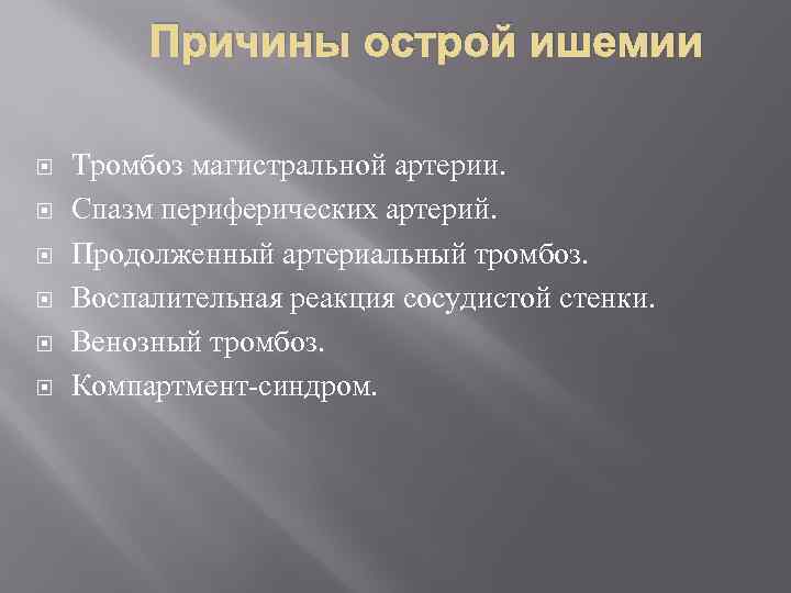 Причины острой ишемии Тромбоз магистральной артерии. Спазм периферических артерий. Продолженный артериальный тромбоз. Воспалительная реакция сосудистой стенки. Венозный тромбоз. Компартмент-синдром.