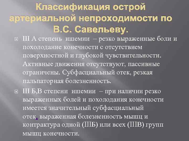 Классификация острой артериальной непроходимости по В. С. Савельеву. III А степень ишемии – резко выраженные боли и похолодание конечности с отсутствием поверхностной и глубокой чувствительности. Активные движения отсутствуют, пассивные ограничены. Субфасциальный отек, резкая пальпаторная болезненность. III Б, В степени ишемии – при наличии резко выраженных болей и похолодания конечности имеется значительный субфасциальный отек, выраженная болезненность мышц и контрактура одной (IIIБ) или всех (IIIВ) групп мышц конечности.