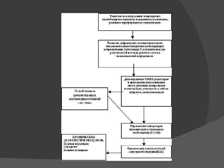 Формирование хронической боли Переферическая сенситизация Нейрогенное воспаление Центральная сенситизация Формирование генераторов патологически усиленного возбуждения (ГПУВ) и патологической алгической системы (ПАС)