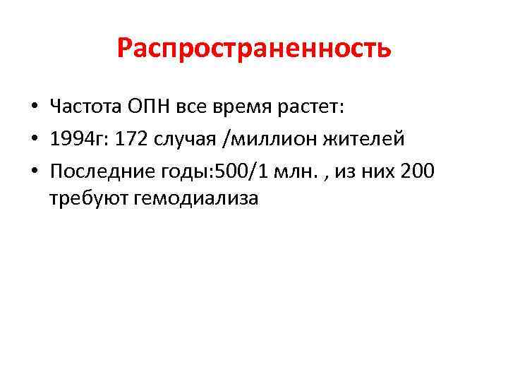 Распространенность • Частота ОПН все время растет: • 1994 г: 172 случая /миллион жителей • Последние годы: 500/1 млн. , из них 200 требуют гемодиализа