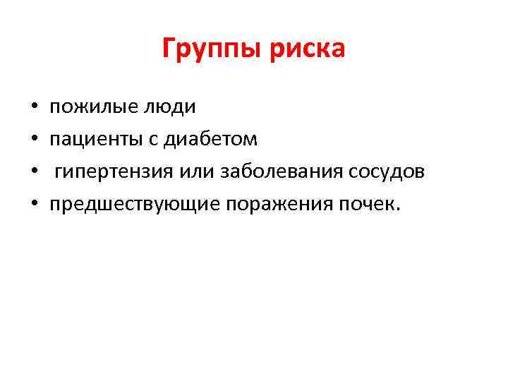 Группы риска • • пожилые люди пациенты с диабетом гипертензия или заболевания сосудов предшествующие поражения почек.