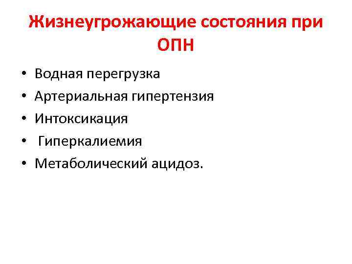 Жизнеугрожающие состояния при ОПН • • • Водная перегрузка Артериальная гипертензия Интоксикация Гиперкалиемия Метаболический ацидоз.