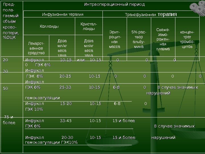 Пред- пола- гаемый объём крово- потери, %ОЦК Интраоперационный период 2020 3030 5050 75 и более Инфукол 10 -15 или 10 -15 0 0 ГЭК 6% Инфукол ГЭК 6% 20 -25 10 -15 0 0 0 Инфукол ГЭК 6% 25 -33 10 -15 6 -8 0 В случае значимых нарушений гемокоагуляции Инфукол 15 -20 10 -15 6 -8 0 ГЭК 10% Инфукол 33 -45 10 -15 15 и более ГЭК 6% В случае значимых Инфукол 20 -30 10 -15 15 и более нарушений гемокоагуляции ГЭК 10% Инфузионная терапия Трансфузионная терапия Коллоиды Кристал- лоиды Лекарст- венное средство Доза мл / кг веса тела Эрит- роцит- ная масса 5% рас- твор альбу- мина Свеже- замо- рожен- ная плазма концен- трат тромбо- цитов