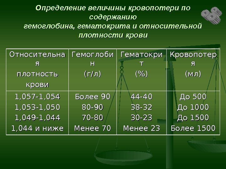 Определение величины кровопотери по содержанию гемоглобина, гематокрита и относительной плотности крови Относительна яя плотность крови Гемоглоби нн (г(г // л)л) Гематокри тт (%)(%) Кровопотер яя (мл) 1, 057 -1, 054 1, 053 -1, 050 1, 049 -1, 044 и ниже Более 90 80 -90 70 -80 Менее 70 44 -40 38 -32 30 -23 Менее 23 До 500 До 1000 До 1500 Более