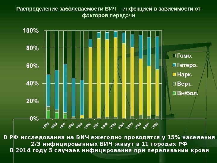 Распределение заболеваемости ВИЧ – инфекцией в зависимости от факторов передачи В РФ исследования на ВИЧ ежегодно проводятся у 15% населения 2/3 инфицированных ВИЧ живут в 11 городах РФ В 2014 году 5 случаев инфицирования при переливании крови