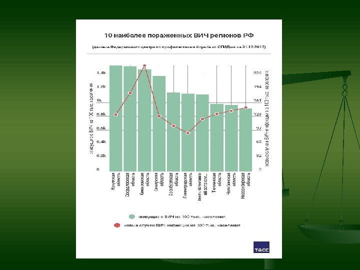 ВИЧВИЧ / / СПИД в Российской Федерации (количество случаев, выявленных за год) 1995 – 196 ; 2001 – 87177 ; 2005 – 22019; 2010 – 58633 ; 2014 – на 1 ноября — 63 863 (без Крыма) Всего в РФ зарегистрировано случаев ВИЧ – инфекции на 01. 2013 – 719 тыс, на 01. 14 – 798 тыс. (5 7 случаев заражения через кровь донора 1: 6400)