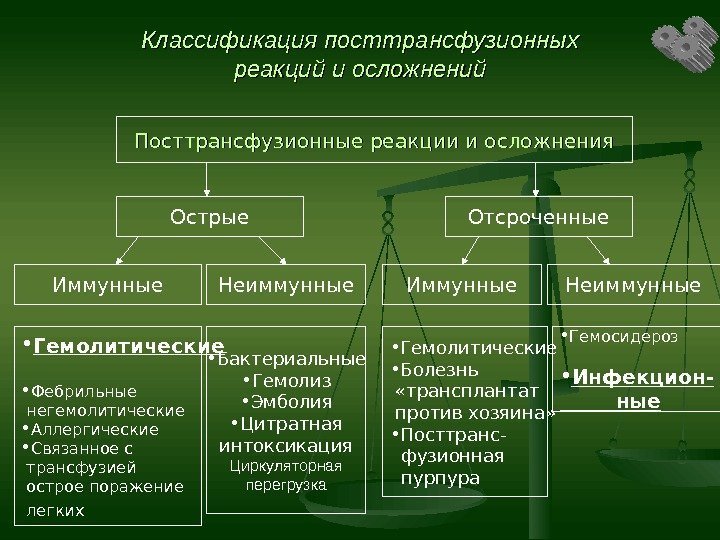 Классификация посттрансфузионных реакций и осложнений Посттрансфузионные реакции и осложнения Острые Отсроченные Иммунные Неиммунные. Иммунные • Гемолитические • Фебрильные негемолитические • Аллергические • Связанное с трансфузией острое поражение легких • Бактериальные • Гемолиз • Эмболия • Цитратная интоксикация Циркуляторная перегрузка • Гемолитические • Болезнь «трансплантат против хозяина» • Посттранс- фузионная пурпура • Гемосидероз • Инфекцион — ные