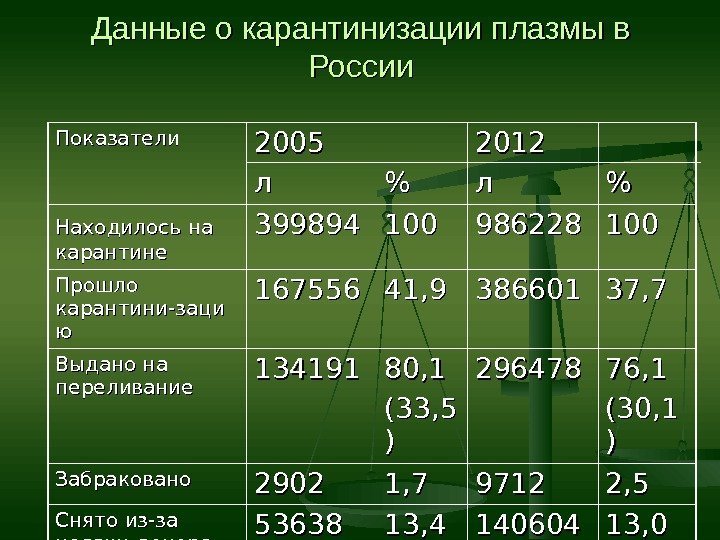 Данные о карантинизации плазмы в России Показатели 2005 лл %% 2012 лл %% Находилось на карантине 399894 100100 986228 100100 Прошло карантини-заци юю 167556 41, 9 386601 37, 7 Выдано на переливание 134191 80, 1 (33, 5 )) 296478 76, 1 (30, 1 )) Забраковано 2902 1, 7 9712 2, 5 Снято из-за неявки донора 53638 13, 4 140604 13,