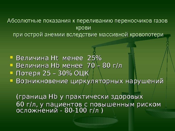 Абсолютные показания к переливанию переносчиков газов крови при острой анемии вследствие массивной кровопотери Величина Н tt менее 25% Величина Н b b менее 70 – 80 г // л л Потеря 25 – 30% ОЦК Возникновение циркуляторных нарушений (граница Hb Hb у практически здоровых 60 г // л, у пациентов с повышенным риском осложнений — 80 -100 г // л )л )