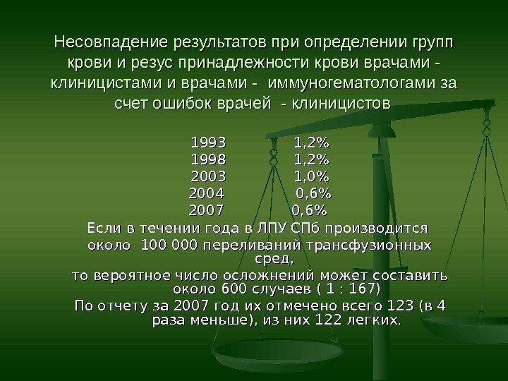 Несовпадение результатов при определении групп крови и резус принадлежности крови врачами — клиницистами и врачами — иммуногематологами за счет ошибок врачей — клиницистов 1993 1, 2% 1998 1, 2% 2003 1, 0% 2004 0, 6% 2007 0, 6% Если в течении года в ЛПУ СПб производится около 100100 000 переливаний трансфузионных сред, то вероятное число осложнений может составить около 6060 0 случаев ( 1 : 167) По отчету за 2007 год их отмечено всего 123 (в 4 раза меньше), из них 122 легких.