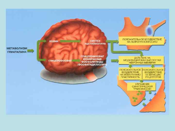 Метаболизм цитиколина и синтез фосфатидилхолина Цитидинтрифосфат Цитидин 1, 2 диацилглицерол Цитиколин Холин Бетаин Глутатион Фосфохолин Метионин Цистеин Цитиколин Фосфатидилхолин S-аденозил-L-метионин S-аденозил-L-гомоцистеин Rao A. M, et al. Brain Res 2001; 893: 268 -272.