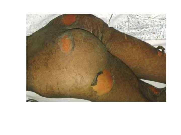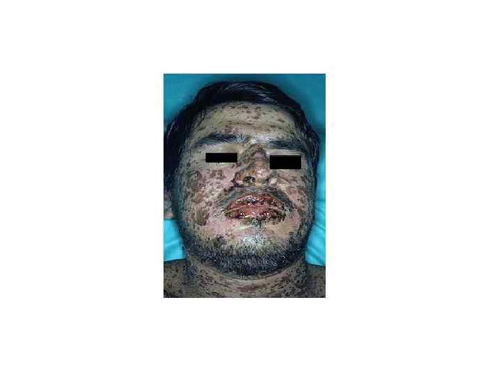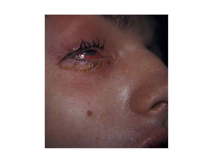 • Поражение половых органов (вагинит, баланопостит) • Геморрагический (с переходом в язвеннонекротический) конъюнктивит — наиболее раннее проявление заболевания • Выраженная общая интоксикация, вызванная потерей жидкости и белка через поражённые эрозированные поверхности, нарушением водно-солевого баланса, развитием инфекционных поражений (часто пневмоний, вторичного инфицирования кожи), кровотечением из ЖКТ вплоть до летального исхода.
