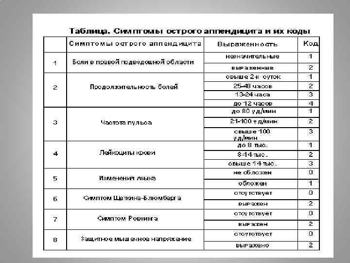 Симптомы аппендицита Язык в начале заболевания влажный, часто обложен белым напетом. Вольной лежит на спине или правом боку; изменение положения тела, кашель, смех, чиханье резко усиливают боль в животе. При осмотре живота может отмечаться отставание правого нижнего квадранта брюшной стенки при дыхании. При пальпации обнаруживают напряжение мышц и резкую болезненность в правой подвздошной области. Здесь же могут определяться положительные симптомы раздражения брюшины (симптом Щеткина - Блюмберга, Раздольского, Воскресенского). Патогномоничных симптомов острого аппендицита нет, вся симптоматика обусловлена явлениями местного перитонита. Боль, как правило, усиливается при положении больного на левом боку (симптом Ситковского), особенно при пальпации (симптом Бартомье - Михельсона). При ретроцекальном расположении отростка может быть положительный симптом Образцова усиление болезненности при поднимании выпрямленной правой ноги.