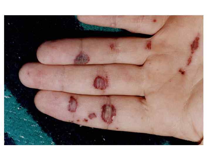Симптомы • Угнетение нормального кроветворения – Анемия – Инфекции (в т. ч. вирусные, грибковые) – Геморрагический синдром • Опухолевые разрастания – – Боли в костях Увеличение печени, селезенки, лимфоузлов Нейролейкемия Поражение кожи 1) специфические изменения; 2)изменения – “сателлиты”; 3) инфекционные поражения кожи; 4) вторичные изменения при химиотерапии. – Поражение других органов (яички, десны, почки, миокард, легкие)
