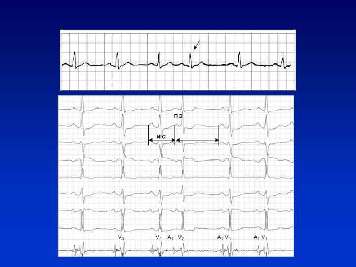 Желудочковая экстрасистолия (ЭКГ-признаки) • Преждевременное появление на ЭКГ измененного комплекса QRS • Значительное расширение (до 0, 12 сек. и больше) и деформация экстрасистолического комплекса QRS • Отсутствие перед желудочковой экстрасистолой зубца Р • Наличие после желудочковой экстрасистолы полной компенсаторной паузы