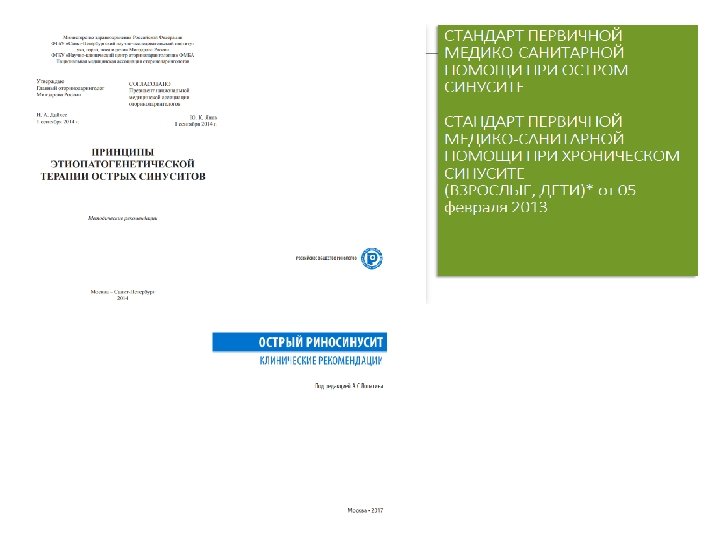 Терапия острых риносинуситов • Системная антибиотикотерапия • Местная антибиотикотерапия: фрамицетин; комбинация антибиотиков (неомицина сульфата, полимиксина В сульфата), дексаметазона и фенилэфрина. • Элиминационно-ирригационная терапия • Ин. ГКС: мометазона фуроат • Назальные деконгестанты • Муколитическая терапия: N-ацетилцистеин в комбинации с тиамфениколом; Nацетилцистеин в комбинации туаминогептаном; миртол