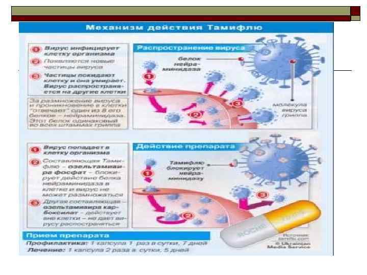 Этиотропная терапия q q q Ингибиторы М 2 , депротеинизации ( «раздевание вируса» ) : АМАНТАДИН, РЕМАНТАДИН - блокировка протонных помп и предотвращение проникновения вируса в клетку(грипп, ОРВИ), АЛЬГИРЕМ (в форме сиропа при ОРВИ у детей), ТРОМAНТАДИН (герпес-инфекция) Ингибиторы транскрипция (репликации вируса): ФОСКАРНЕТ, ВАЛТРЕКС (ацикловир + аминокислота ВАЛИН), ЦИТАРАБИН (ЦМВ), РИБАВИРИН (герпес, РНКвирусы: гриппа А и В, парагриппа, кори) Индукторы интерферона: анаферон, циклоферон, арбидол, амиксин, неовир Ингибиторы нейраминидазы - тамифлю Нормальный человеческий иммуноглобулин