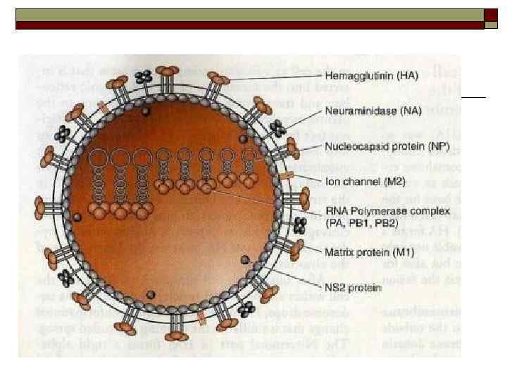 Характеристика Orthomyxoviruses o o Вирион имеет сферическую форму или нитевидную Диаметр 100 -120 нм В наружную липидную оболочку погружены три белка - гемагглютинин, нейраминидаза и ионный канал (белок М 2), играющие основную роль в инфекционном процессе. Под липидной оболочкой матриксный М 1 белок – выполняет структурную функцию и организует сборку вируса в клетке хозяина