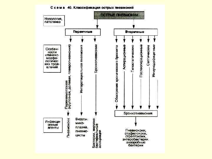 КЛАССИФИКАЦИЯ ОСТРЫХ ПНЕВМОНИЙ • • • По эпидемиологии контагиозные, внутрибольничные (нозокомиальные) По этиологии По патогенезу: первичные и вторичные У детей: Внутриутробная (врожденная) – первые 72 часа Приобретенные (постнатальные) – через 72 часа Ранние неонатальные - первые 5 -6 дней Поздние неонатальные – на 2 й неделе жизни • • По клинико-морфологическим особенностям: лобарная (крупозная) • бронхопневмония (очаговая) • острая интерстициальная или межуточная (острый альвеолит или пневмонит) • • По характеру течения: легкие, средней тяжести, тяжелые Острые (4 -6 нед) и затяжные(2 -6 мес. ) атипичные ( острые межуточные пневмонии) • •