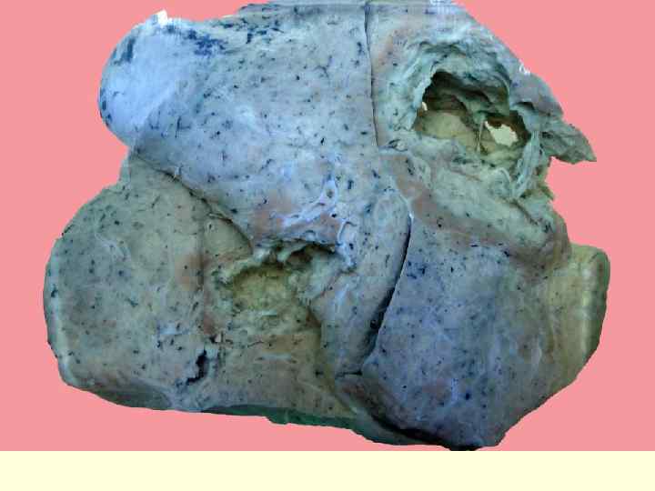 • Пневмония Фридлендера Болезнь легионеров • Клебсиелла • лобарная пневмония (псевдо-) • аспирационная, внутрибольничная • правая верхняя доля • некроз альвеолярных перегородок • формирование абсцессов, очагов карнификации и фиброза • Легионелла • бронхопневмония с вовлечением нескольких долей • может напоминать крупозную в стадии серого опеченения с фибринозным плевритом • гемморрагический отек, инфильтрация межальвеолярных перегородок макрофагами и ПЯЛ