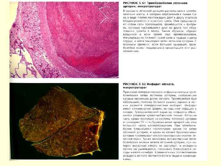 2. КРАСНЫЕ ИНФАРКТЫ ЛЕГКИХ (10% ТЭЛА): • 75% больных – локализация в верхних долях • >50% - множественные • Размеры- чаще небольшие, могут варьировать • Треугольная форма, вершина к корню легкого, если инфаркт расположен близко к плевре – наложения фибрина (к концу 1 сут. ) • Ткань темно-красная, немного западает • Через 2 сут: • зона инфаркта бледнеет из-за гемолиза эритроцитов • Позже: красно-коричневая – гемосидерин • Исходы: • 1. Образование рубца • 2 нед. – организация инфаркта по периферии, до нескольких месяцев • образуется нежный втянутый рубчик со звездчатым утолщением плевры над ним • 2. Осложнения: инфицирование – септический инфаркт с развитием микробной эмболии или абсцесса легкого