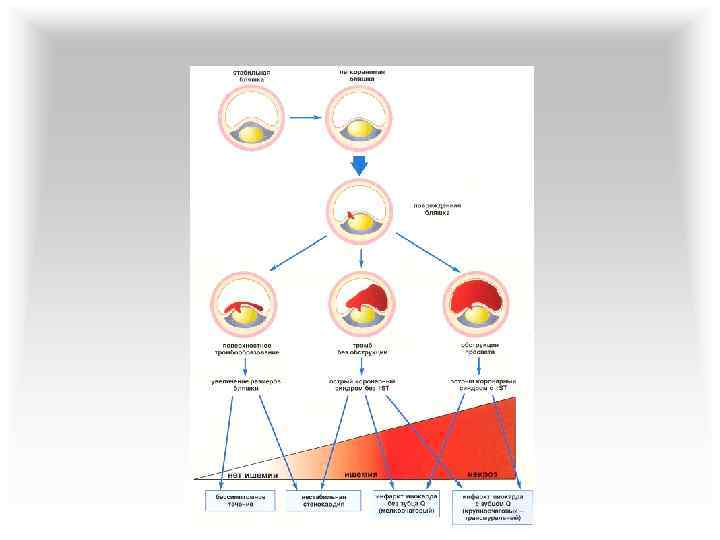 ЭВОЛЮЦИЯ НЕСТАБИЛЬНОЙ СТЕНОКАРДИИ ОСНОВНЫЕ ФАКТОРЫ КОРОНАРНОЙ ОККЛЮЗИИ • Нестабильная атеросклеротическая бляшка – трещины и надрывы фиброзной покрышки в дистальном отделе стеноза – поражение в области выраженного атеросклеротического стеноза и в минимально стенозированном сегменте (чаще) – увеличение вероятности разрыва бляшки в результате положительного экстравазального ремоделирования стенозированного участка сосуда • Формирование фибринозно-тромбоцитарного тромба – запуск процесса образования пристеночного тромба – вначале тромбоцитарного, затем фибринозного – формирование окклюзирующего тромба, быстрое нарастание выраженности стеноза • Нарушение сосудистого тонуса (вазоконстрикция) – формирование патологических вазомоторных реакций до развития гемодинамически значимого стеноза (дисфункция эндотелия) – снижение способности к вазодилатации, склонность к вазоконстрикции в том числе в ответ на различные стимулы
