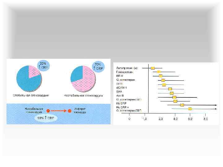 БИОХИМИЧЕСКИЕ МАРКЕРЫ ПРИ ОКС • • Маркеры повреждения миокарда сердечные тропонины Т или I. Повышенный уровень – свидетельство некроза клеток и основание для диагноза ИМ без подъема ST. Показатель стратификации риска и определения тактики лечения МВ-КФК Редко – миоглобин и ЛДГ Маркеры воспаления С-реактивный белок. Риск развития коронарных осложнений возрастает с увеличением концентрации Мозговой натрийуретический пептид. Синтезируется в желудочках сердца. Чувствительность в отношении ишемического повреждения превосходит тропонин Клиренс креатинина. При сниженном клиренсе существенно хуже прогноз