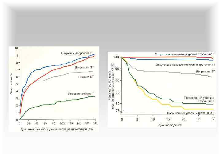 СТРАТИФИКАЦИЯ РИСКА ОСТРОГО КОРОНАРНОГО СИНДРОМА БЕЗ ПОДЪЕМА СЕГМЕНТА ST Высокий риск Учащение ангинозных приступов в предшествующие 48 ч Продолжительные (более 20 мин) боли в покое Отек легких, вероятно, связанный с ишемией, новый систолический шум, хрипы, артериальная гипотензия, брадикардия, тахикардия. Возраст старше 75 лет Транзиторное смещение ST более, чем на 0, 05 м. В. Предположительно новая блокада ножки п. Гиса. Устойчивая ЖТ Повышение тропонина Т или I выше 0, 1 нг/мл Промежуточный риск Анамнез ИМ в анамнезе, коронарное шунтирование, атеросклероз в других областях. Прием АСК Характеристика болей Продолжительные (более 20 мин) боли в покое, в настоящее время купированные. Стенокардия покоя (менее 20 мин) или приступы, проходящие в покое и после приема нитроглицерина Физикальное исследование Возраст старше 70 лет ЭКГ Инверсия Т более, чем на 0, 2 м. В. Патологические Q Сердечные маркеры Незначительное повышение тропонина Т от 0, 001 до 0, 1 нг/мл Низкий риск Нет данных Впервые возникшая и прогрессирующая стенокардия III или IV ФК в течение 2 недель без продолжительных (более 20 мин) болей Норма. Отсутствие динамики во время приступов Норма