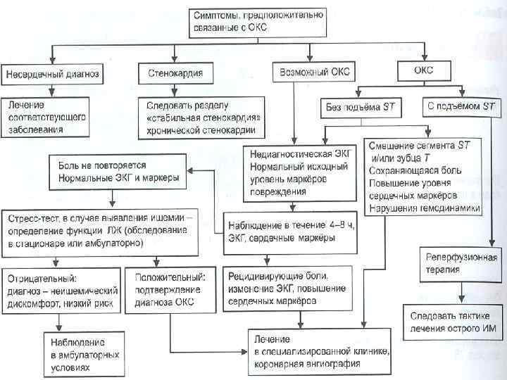 ВЕРОЯТНОСТЬ ОКС БЕЗ ПОДЪЕМА ST Высокая вероятность Боль или дискомфорт в грудной клетке или левой руке. Появление ранее подтвержденной стенокардии. В анамнезе ИБС, включая перенесенный ИМ Вновь возникшая преходящая митральная регургитация, артериальная гипотензия, влажные хрипы в легких Новые изменения в виде смещения ST (более 0, 05 м. В) или инверсия Т (глубиной более 0, 2 м. В) в сочетании с клиникой Повышение уровня тропонинов или МВ-КФК Промежуточная вероятность Низкая вероятность Анамнез Боль и дискомфорт в грудной клетке или левой руке. Возраст старше 50 лет Маловероятные ишемические симптомы Физикальное исследование Признаки поражения внесердечных сосудов ЭКГ Стойкие зубцы Q. Изменения сегмента ST и зубца Т, которые нельзя рассматривать как впервые возникшие Сердечные маркеры Норма Воспроизведение болевых ощущений при пальпации грудной клетки Уплощение зубца Т или его инверсия в отведениях с доминирующим зубцом R. Нормальная ЭКГ Норма