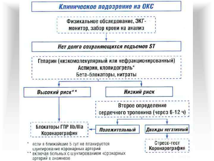 ПОСЛЕДОВАТЕЛЬНОСТЬ ДЕЙСТВИЙ ПРИ ВЕДЕНИИ БОЛЬНЫХ ОКС БЕЗ ПОДЪЕМОВ ST Блок интенсивной терапии (отделение) (2) • Повторно оценить риск через 8 -12 часов: при высоком риске – продолжить введение гепарина (НФГ 2 -5 сут, НМГ до 8 сут), при низком – прекратить введение и перевести больного в кардиологическое (терапевтическое) отделение • При высоком риске осложнений, особенно при нестабильной гемодинамике (гипотония, застой в легких) при возможности начать в/венное введение антагониста гликопротеинов IIb/IIIа тромбоцитов (тирофибан, эптифибатид) • Если стабилизация не достигнута комплексной терапией – экстренная коронарография и (с учетом результатов) процедура реваскуляризации • Перевод в кардиологическое (терапевтическое) отделение после прекращения в/венного гепарина (п/кожно НМГ можно вводить в обычном отделении)