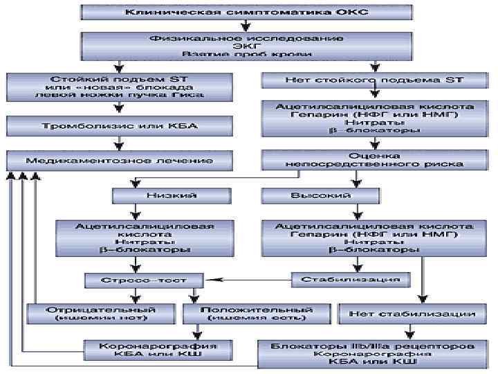 Алгоритм лечения Догоспитальный этап Снятие ЭКГ, исключение ИМ Купирование болевого симптома (при недостаточном эффекте нитратов, вводят наркотические анальгетики в/в морфин 2 мг, каждые 5 мин, максимальная доза 8 мг) Антикоагулянтная терапия (гепарин 12 -15 ЕД/кг/час начальная доза подкожно) Дезагрегантная терапия (аспирин в начальной дозе 160325 мг) В-блокаторы (пропранолол 0, 5 -1 мг в/в )