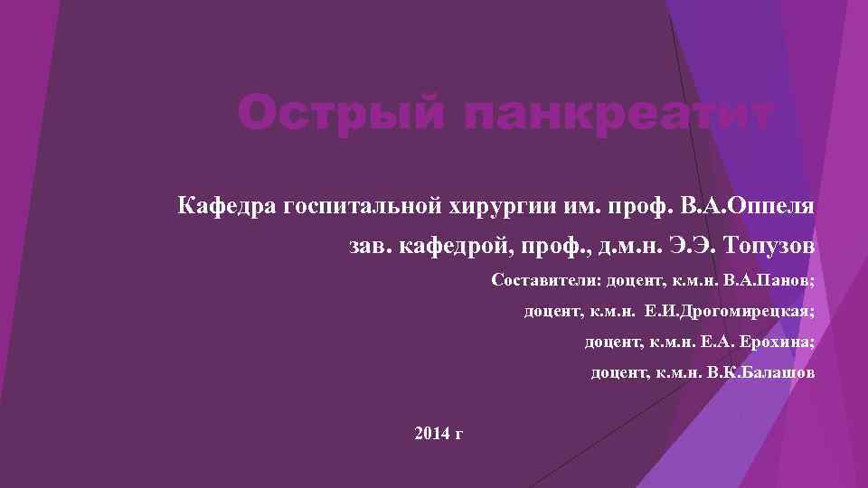 Острый панкреатит Кафедра госпитальной хирургии им. проф. В. А. Оппеля зав. кафедрой, проф. , д. м. н. Э. Э. Топузов Составители: доцент, к. м. н. В. А. Панов; доцент, к. м. н. Е. И. Дрогомирецкая; доцент, к. м. н. Е. А. Ерохина; доцент, к. м. н. В. К. Балашов 2014 г