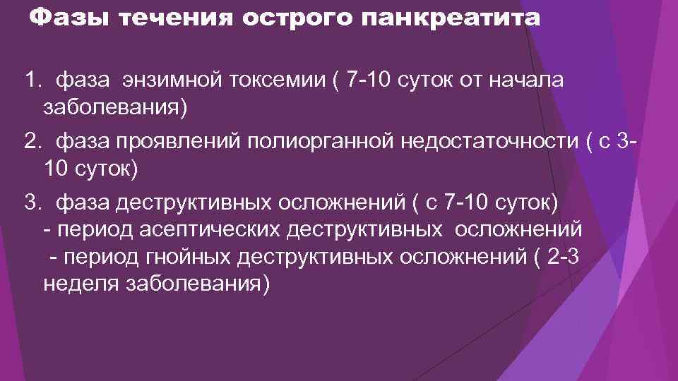 Фазы течения острого панкреатита 1. фаза энзимной токсемии ( 7 -10 суток от начала заболевания) 2. фаза проявлений полиорганной недостаточности ( с 310 суток) 3. фаза деструктивных осложнений ( с 7 -10 суток) - период асептических деструктивных осложнений - период гнойных деструктивных осложнений ( 2 -3 неделя заболевания)