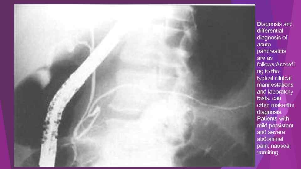 Diagnosis and differential diagnosis of acute pancreatitis are as follows: Accordi ng to the typical clinical manifestations and laboratory tests, can often make the diagnosis. Patients with mild persistent and severe abdominal pain, nausea, vomiting,