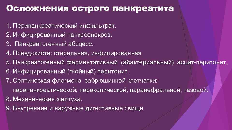 Осложнения острого панкреатита 1. Перипанкреатический инфильтрат. 2. Инфицированный панкреонекроз. 3. Панкреатогенный абсцесс. 4. Псевдокиста: стерильная, инфицированная 5. Панкреатогенный ферментативный (абактериальный) асцит-перитонит. 6. Инфицированный (гнойный) перитонит. 7. Септическая флегмона забрюшинной клетчатки: парапанкреатической, параколической, паранефральной, тазовой. 8. Механическая желтуха. 9. Внутренние и наружные дигестивные свищи.