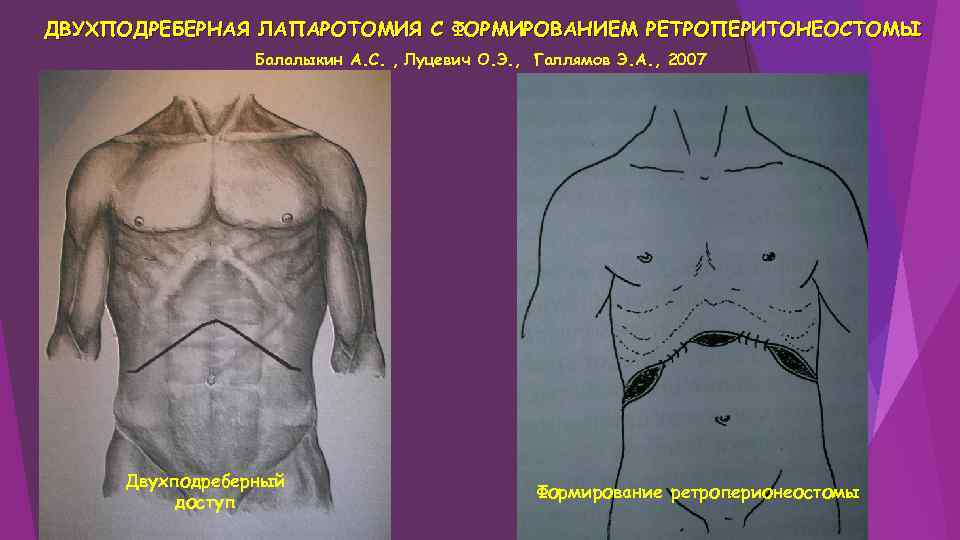 ДВУХПОДРЕБЕРНАЯ ЛАПАРОТОМИЯ С ФОРМИРОВАНИЕМ РЕТРОПЕРИТОНЕОСТОМЫ Балалыкин А. С. , Луцевич О. Э. , Галлямов Э. А. , 2007 Двухподреберный доступ Формирование ретроперионеостомы