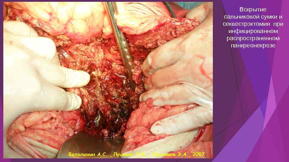 Вскрытие сальниковой сумки и секвестрэктомия при инфицированном распространенном панкреонекрозе Балалыкин А. С. , Луцевич О. Э. , Галлямов Э. А. , 2007