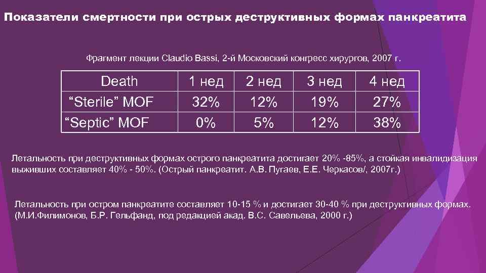 Показатели смертности при острых деструктивных формах панкреатита Фрагмент лекции Claudio Bassi, 2 -й Московский конгресс хирургов, 2007 г. Death “Sterile” MOF “Septic” MOF 1 нед 32% 0% 2 нед 12% 5% 3 нед 19% 12% 4 нед 27% 38% Летальность при деструктивных формах острого панкреатита достигает 20% -85%, а стойкая инвалидизация выживших составляет 40% - 50%. (Острый панкреатит. А. В. Пугаев, Е. Е. Черкасов/, 2007 г. ) Летальность при остром панкреатите составляет 10 -15 % и достигает 30 -40 % при деструктивных формах. (М. И. Филимонов, Б. Р. Гельфанд, под редакцией акад. В. С. Савельева, 2000 г. )