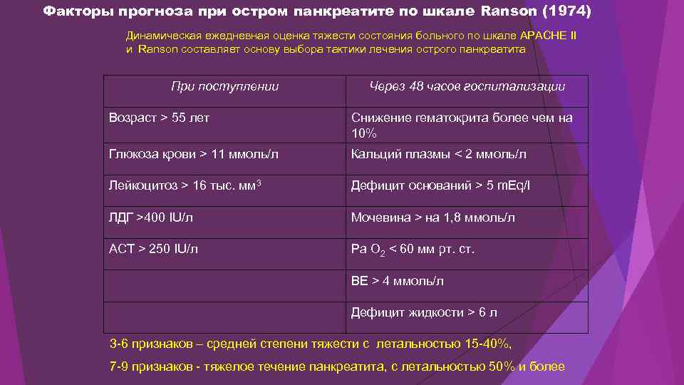 Факторы прогноза при остром панкреатите по шкале Ranson (1974) Динамическая ежедневная оценка тяжести состояния больного по шкале APACHE II и Ranson составляет основу выбора тактики лечения острого панкреатита При поступлении Через 48 часов госпитализации Возраст > 55 лет Снижение гематокрита более чем на 10% Глюкоза крови > 11 ммоль/л Кальций плазмы < 2 ммоль/л Лейкоцитоз > 16 тыс. мм 3 Дефицит оснований > 5 m. Eq/l ЛДГ >400 IU/л Мочевина > на 1, 8 ммоль/л АСТ > 250 IU/л Ра О 2 < 60 мм рт. ст. ВЕ > 4 ммоль/л Дефицит жидкости > 6 л 3 -6 признаков – средней степени тяжести с летальностью 15 -40%, 7 -9 признаков - тяжелое течение панкреатита, с летальностью 50% и более