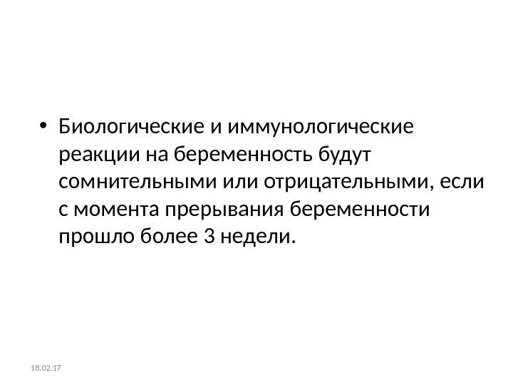 • Биологические и иммунологические реакции на беременность будут сомнительными или отрицательными, если с момента прерывания беременности прошло более 3 недели. 18. 02.