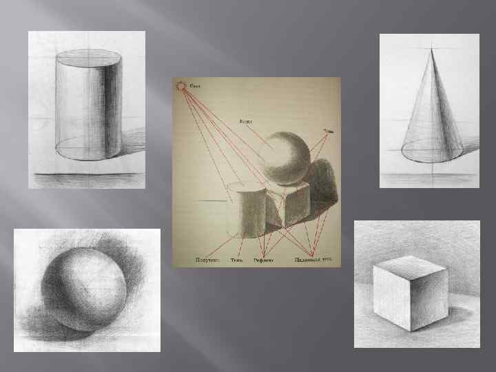 Объемная форма предметов передается на рисунке не только построенными с учетом перспективных сокращений поверхностями, но и с помощью светотени.