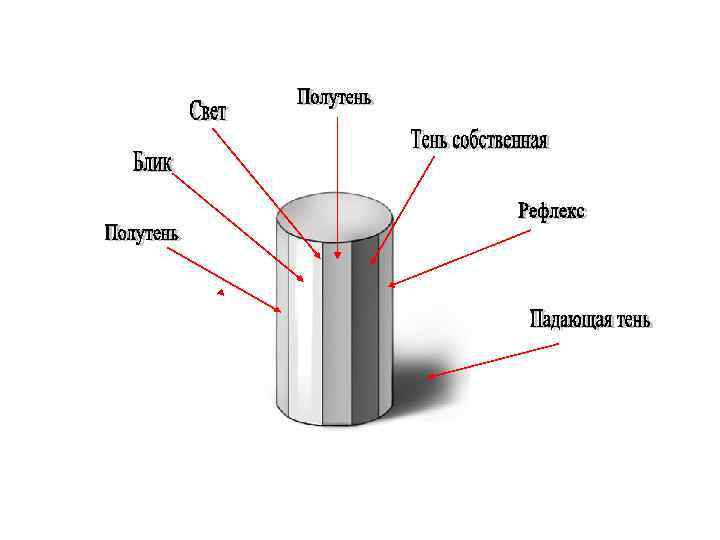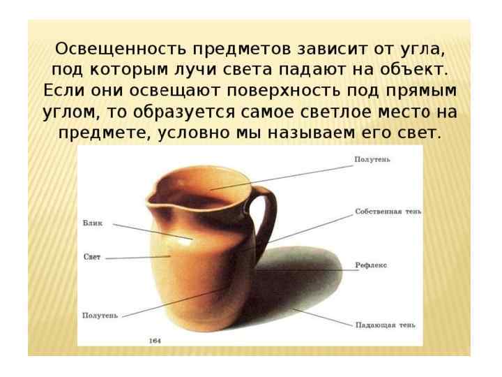 Объемная форма предметов передается на рисунке не только построенными с учетом перспективных сокращений поверхностями, но и с помощью светотени.