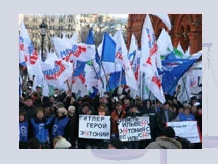 Вопросы: n n n n Являются ли действия эстонских властей фашистскими? Насколько этично было переносить памятник накануне Дня Победы? Как можно было по- другому решить вопрос с переносом памятника? Возможно ли применение силовых мер при разгоне демонстрантов? Какие действия необходимо предпринять для урегулирования отношений между эстонской и русской частью населения? Имеет ли Россия право вмешиваться в деятельность другого государства и выставлять свои требования? Какие проблемы могут возникнуть у России и Эстонии на международной арене?