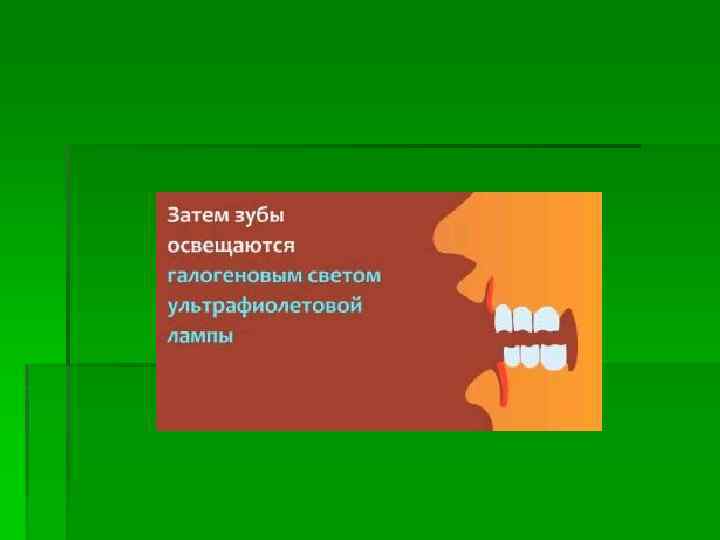 § § § § § Противопоказания к отбеливанию зубов: Несанированная полость рта Крупная камера пульпы зуба Наличие ортодонтических конструкций Воспалительные заболевания пародонта в стадии обострения Большое количество кариозных областей, некачественные пломбы, зубные отложения Наличие аллергической реакции на перекись водорода или другие составляющие препарата, применяемые при отбеливании Наличие обнаженной шейки зуба, эрозии Значительная убыль эмали в результате патологической или возрастной стираемости, глубокие трещины на поверхности эмали Беременность или период кормления грудью Детский возраст до 16 лет