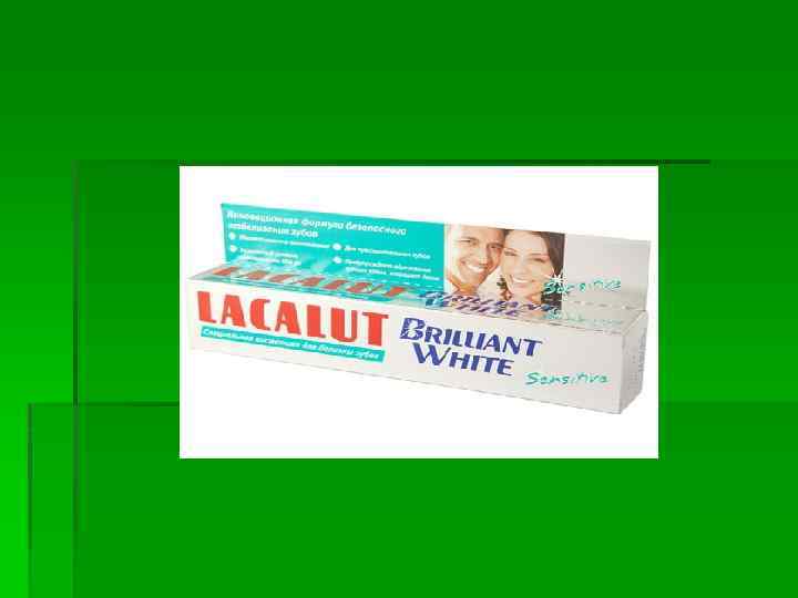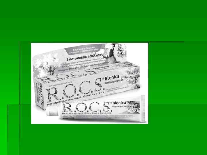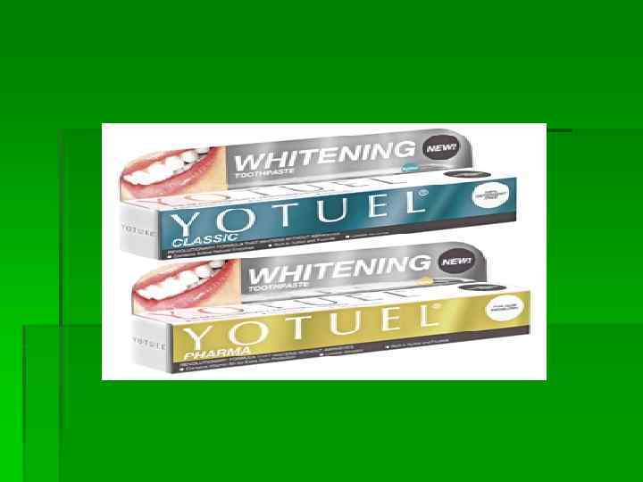 Отбеливающие зубные пасты § Их действие направлено на очищение зубов за счет абразивного воздействия или отбеливающих свойств. § К веществам, используемым для отбеливания относятся цитроксаин, бикарбонат натрия, гидратированная окись кремния, а также полирующие компоненты повышенной зернистости. § Однако такими пастами нельзя пользоваться постоянно, при регулярном использовании они могут оказывать и негативное воздействие: вызывать эрозии и истирания твердых тканей зуба или травму мягких тканей вокруг них