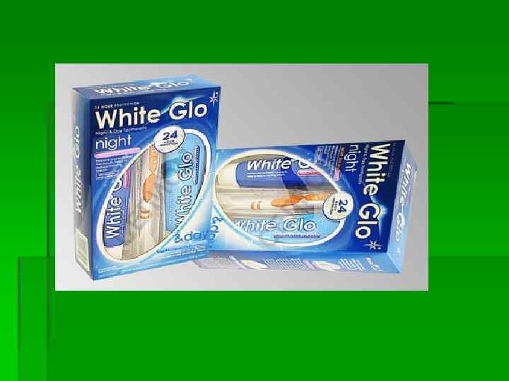 White Glo ночной гель и дневная зубная паста с зубной щеткой § Дневная зубная паста отбеливает и полирует зубы. § Содержит карнаубский воск, который создает защитную микропленку на зубах и придает зубной эмали сияние. § Ночной гель обеспечивает длительную защиту и свежесть полости рта. § Содержит экстракт зеленого чая – натурального природного антиоксиданта.