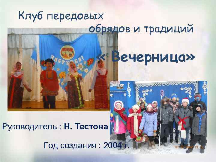 Клуб передовых обрядов и традиций « Вечерница» Руководитель : Н. Тестова Год создания : 2004 г.