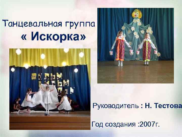 Танцевальная группа « Искорка» Руководитель : Н. Тестова Год создания : 2007 г.