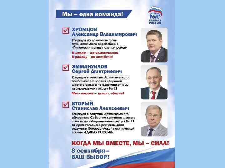 ПРЕДВЫБОРНАЯ ПРОГРАММА кандидата на должность главы муниципального образования «Пинежский Муниципальный район» А. В. Хромцова, кандидата в депутаты Архангельского областного собрания депутатов шестого созыва по 21 одномандатному избирательному округу С. Д. Эммануилова, кандидата в депутаты Архангельского областного собрания депутатов шестого созыва по 21 избирательному округу от партии «Единая Россия» С. А. Второго.